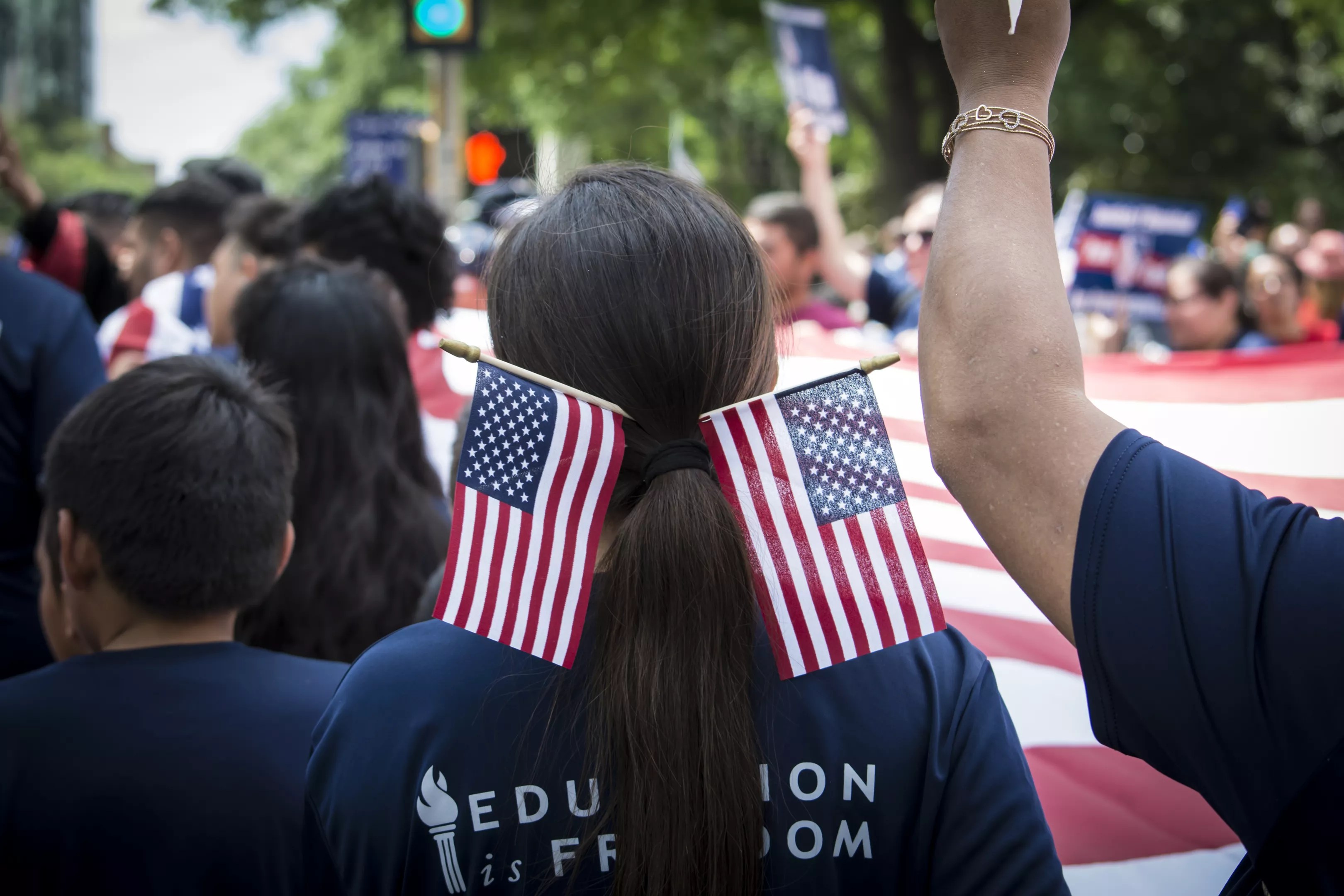 Flags adorn a girl’s ponytail at the Mega March 2017.