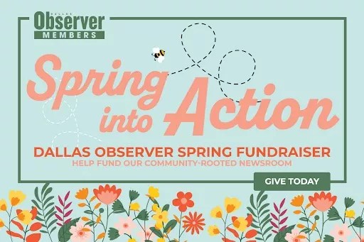 Between today and June 7, our goal is to raise $4,000 from readers. You can help by becoming a member and giving any amount to support our newsroom. Considering that 26,000 people turn to the Dallas Observer for a shot of news every day, we’re optimistic y’all like and value us enough that we can meet – or exceed – that goal.