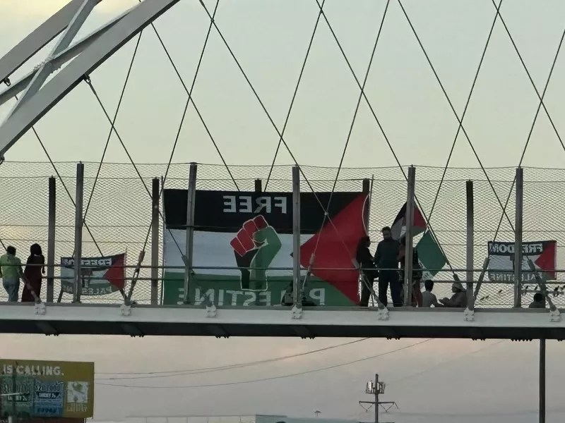 Stickers, chalk markings and phrases written in permanent marker were left on the Northaven Bridge following a Pro-Palestine protest.