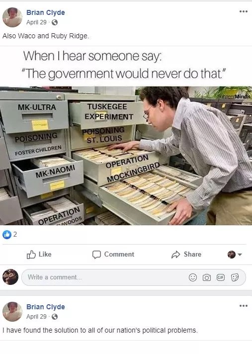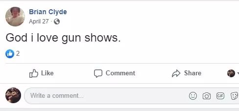 On his page, Clyde also expressed anti-federal government rhetoric and a love for gun shows. Anti-federal government meme from Brian Clyde’s Facebook page Brian Clyde via Facebook