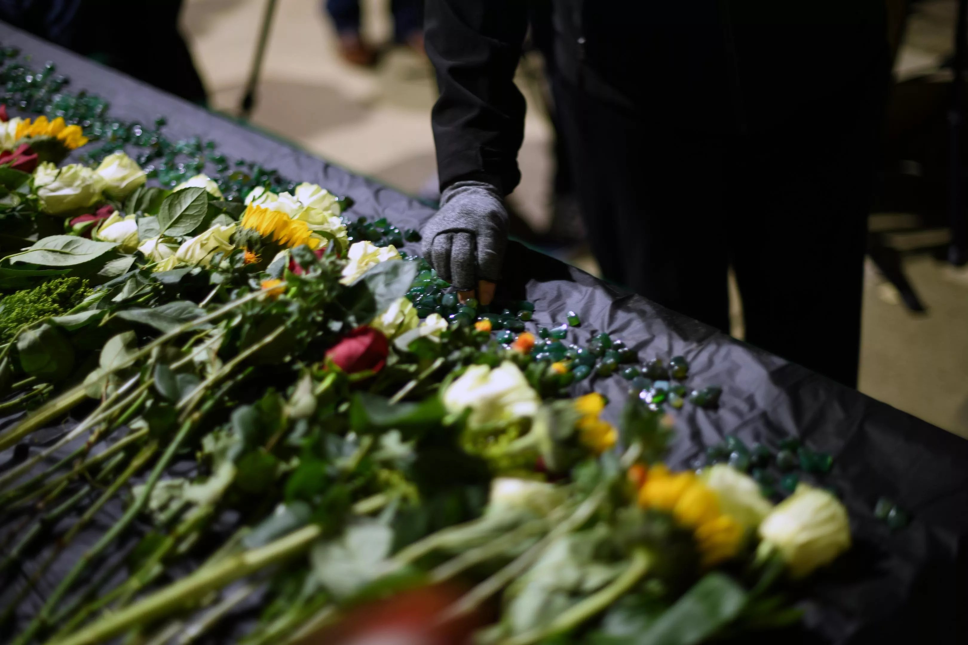 Pebbles and flowers were displayed on a table for vigil attendees to take home. James Jackson, board member for PRIDENTON, shared that in some traditions, rocks were available at memorials for attendees to take one and keep in their pocket. “They would carry it around for as long as necessary as a token of the person they’ve lost with the intention of leaving the stone at the gravesite the next time they would visit,” he said.