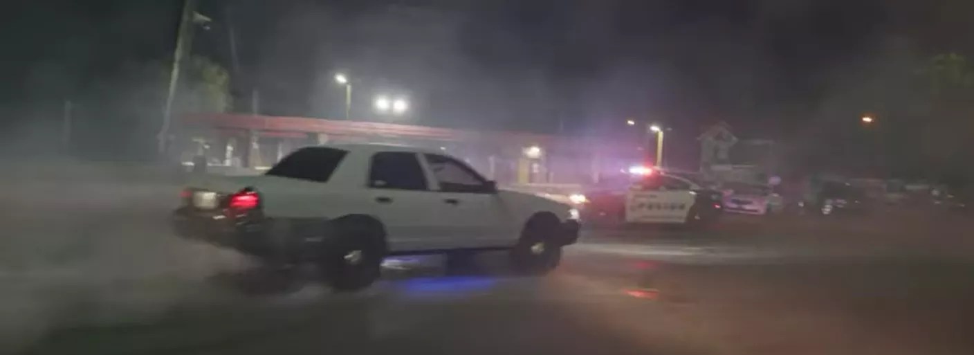 One scene in Grant’s piece is especially instructive. If you go look, it’s about 2 minutes, 30 seconds into the eight-minute video. In it, you will see nighttime video of a street racer brazenly doing loud, squealing doughnuts with his car right in front of a Dallas police car parked at the entrance of the car wash three months after it was closed. The car speeds off into the night with the police in pursuit.