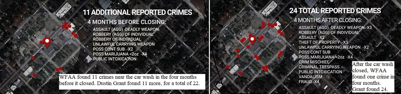 In the four-month period after the car wash closed, WFAA says the car wash area saw only one crime. Grant says it was 24. OK. But in that same period, the circle around the WFAA studios saw 26 crimes.