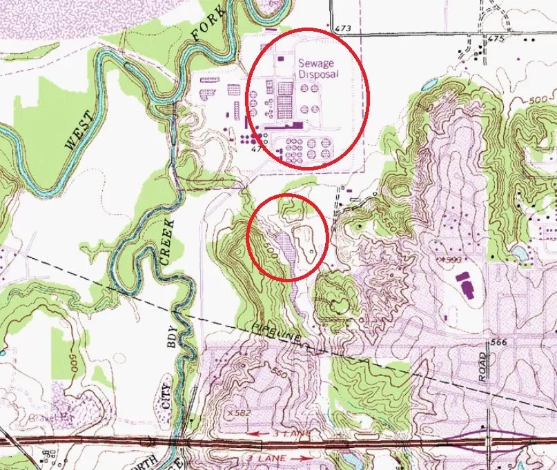 The smaller red circle indicates Lake Prestonwood. The larger circle above it is the Village Creek Wastewater Treatment Plant.