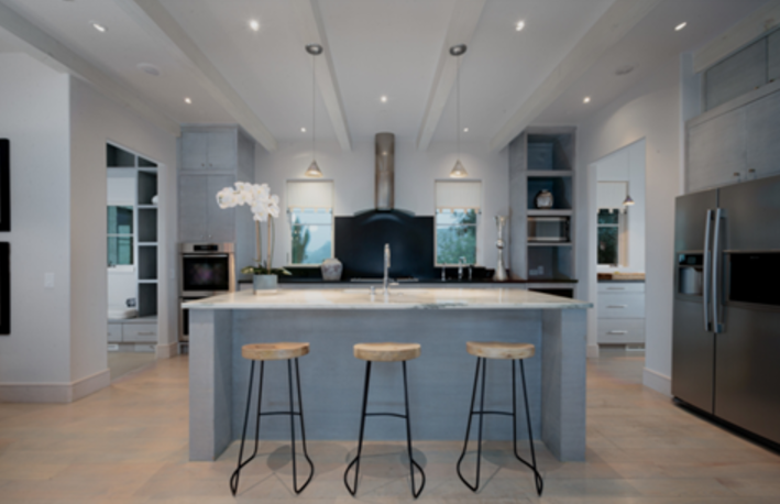 The house features marble countertops and custom limestone and travertine floors.