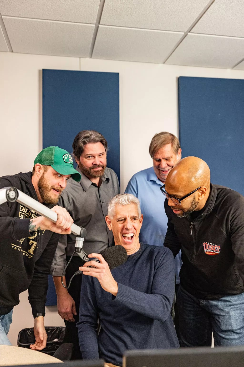 From left: Dave Lane, David Mino, Bob Sturm, Sean Bass and Corby Davidson (seated) of 1310 The Ticket.