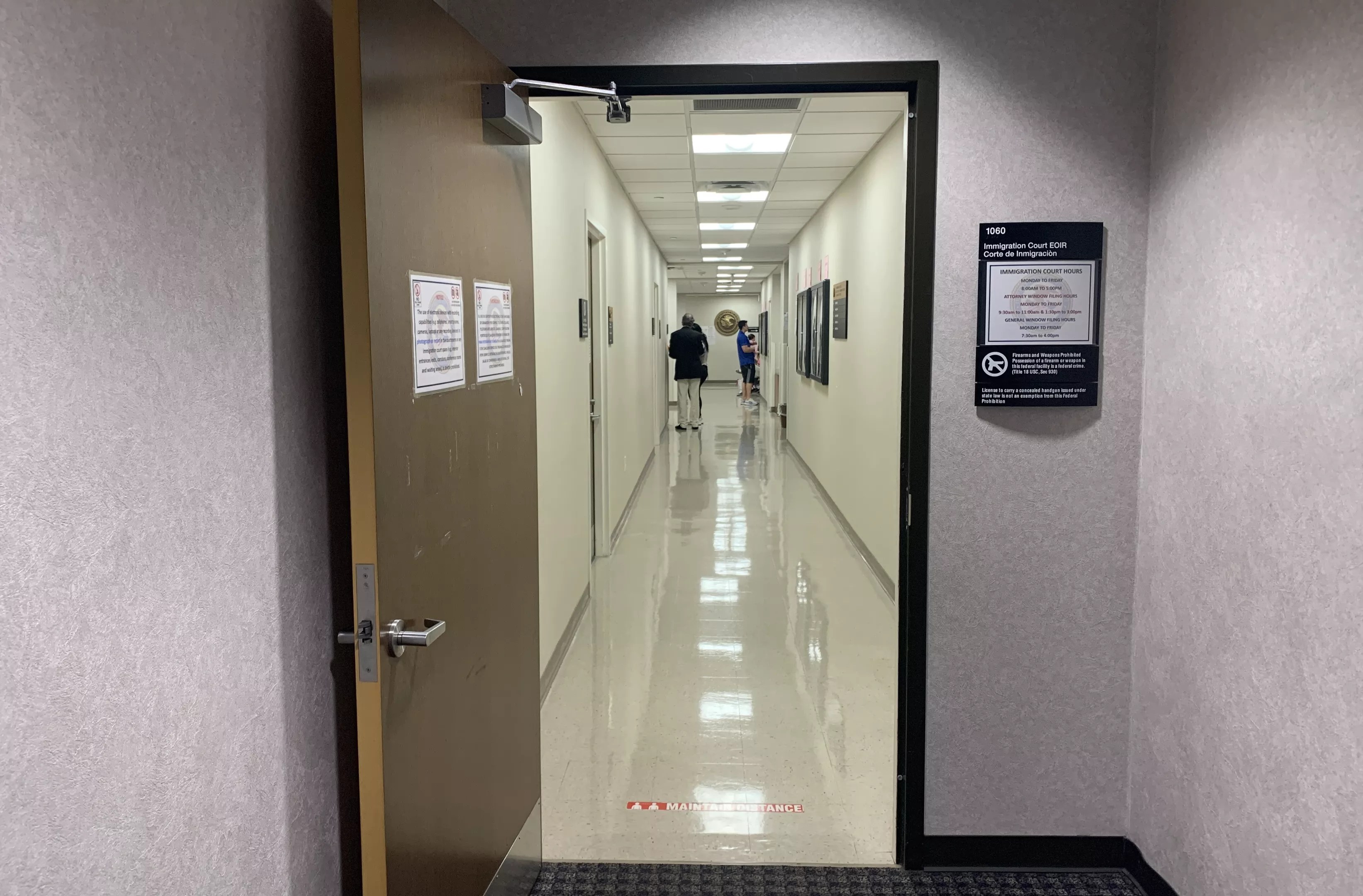 Photographs are no longer allowed in the immigration courtroom once the floor turns to linoleum.