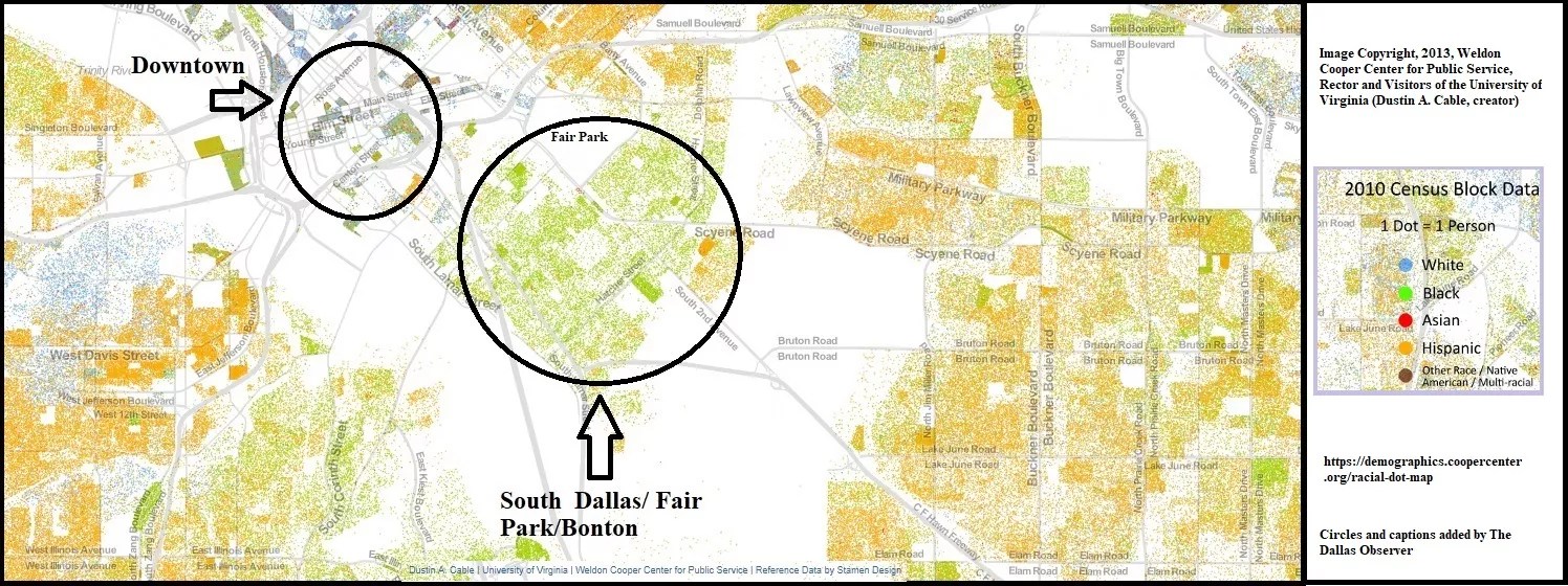 The best demographic rendering I have been able to find is the “dot racial map” from the Weldon Cooper Center for Public Service at the University of Virginia. Its limitation is that it is based on 2010 census data, now almost a decade out of date. But even 10 years ago, the dot racial map depicts an influx of Hispanics almost surrounding South Dallas.