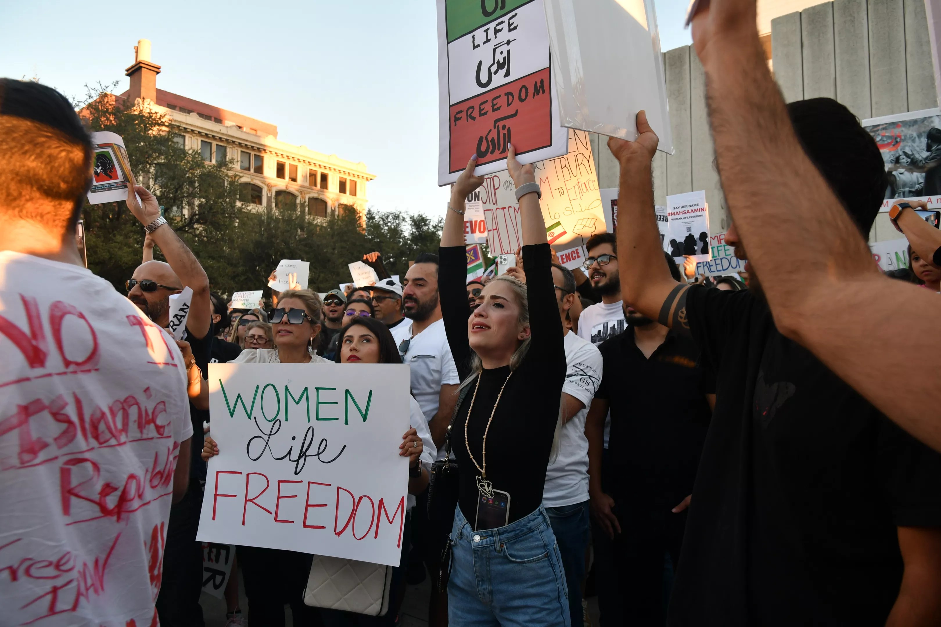 She was right about that. In the past two months, she has taken part in several protests, ranging from a few dozen people to hundreds and even more in the Dallas area. No mask, no hat, no glasses. She’s one of the many who paint the words “Women Life Freedom” on their skin when marching.