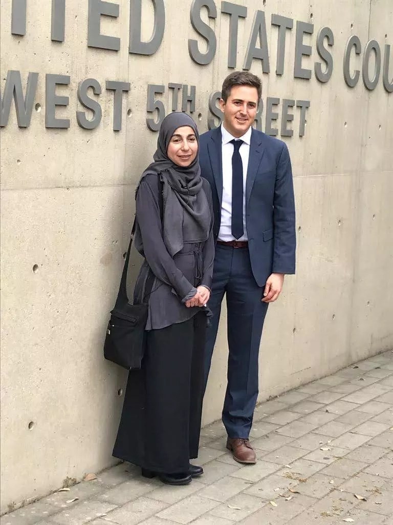 George Hale with co-plaintiff Bahia Amawi, a school speech pathologist in Pflugerville, outside the federal courts in Austin where a judge had just ruled in their favor.
