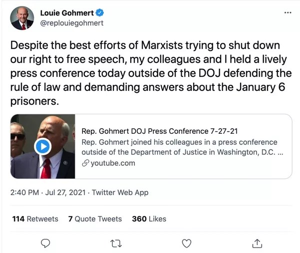 In a Monday tweet, Gohmert wrote, “Sadly, two systems of justice exist in America today: one for former President Trump along with those who support or don’t hate him, and the other for everyone else.”