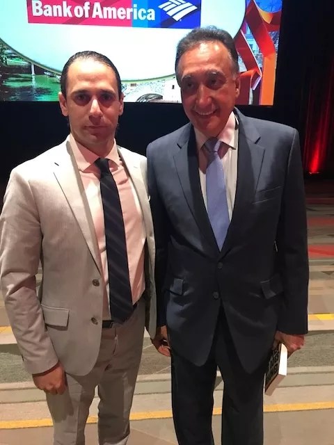 Khraish Khraish (left) visits with Henry Cisneros, former Housing and Urban Development secretary and San Antonio mayor, at the recent national LULAC convention in San Antonio.