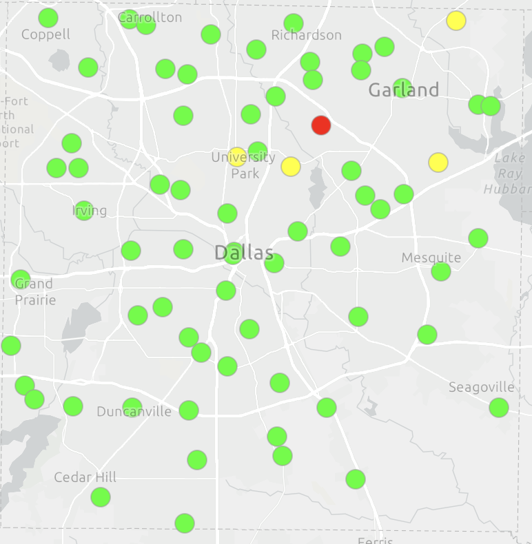 On Monday around 2 p.m., for example, the dot for El Centro College was green, with no wait reported; the map dot for University Park United Methodist Church was yellow, thanks to a 20-minute wait time; and Audelia Road Branch Library showed as red due to a wait time of 34 minutes.