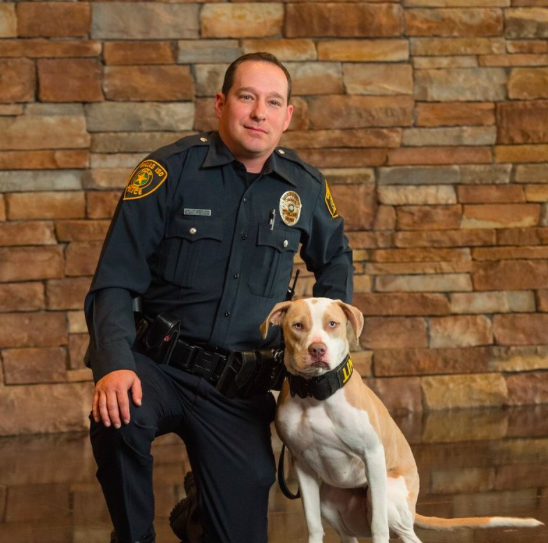 The canine, a white and brown pit bull named Athena, will focus largely on middle schools, Harris says. “That’s an adolescent age and that’s a time when they’re really persuaded by different events,” she says. “It’s a middle school. It’s that funny period.”