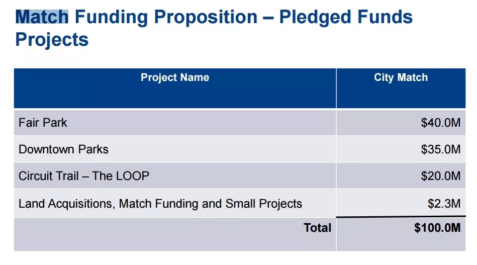 Under the no hamburger rule, certain projects in which matching funds have been promised would be placed in a separate proposition for voters. In this case it would be an approval for the city to borrow a total of $100 million to pay for reviving Fair Park, new parks downtown, the circuit trail around the city and other land acquisitions.