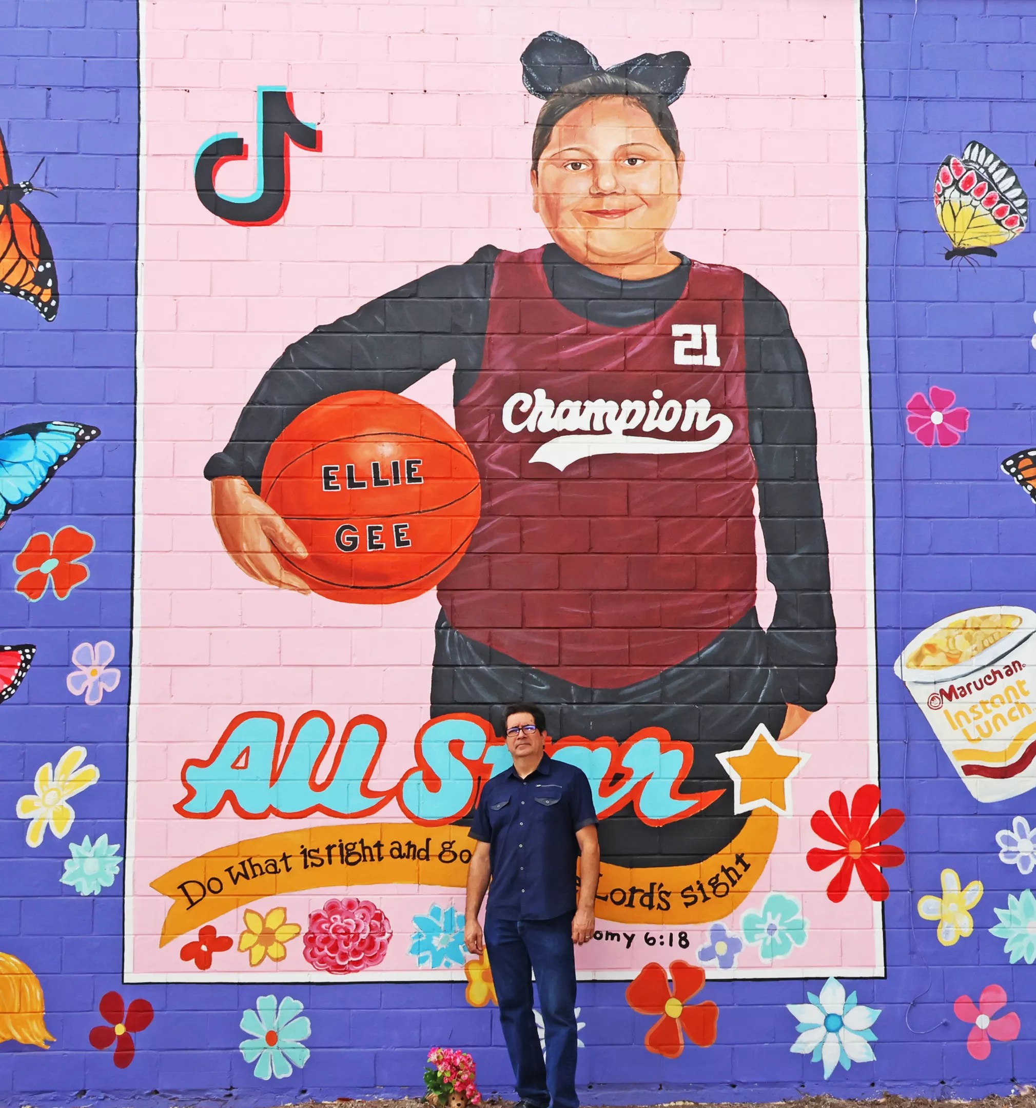 Ortiz-Acosta poses beneath the mural of Eliahna “Ellie” Amyah Garcia that he painted.