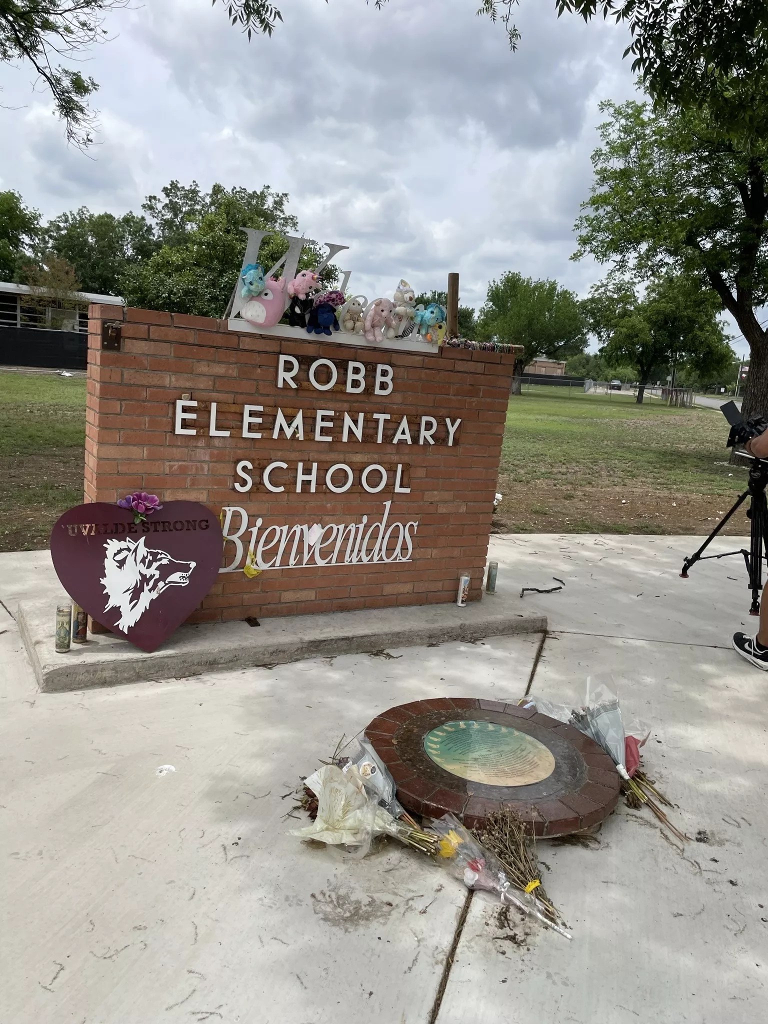 Near the school’s main entrance, a large white sign with thick red letters reading “Robb Elementary, Together We Rise!” is attached to the brown brick building. To see it you have to look over the tall, black tarp-covered chain link fence. That sign is just around the corner from the side door that Salvador Ramos, who was killed by law officers, busted through as he shot his way through the school’s parking lot.
