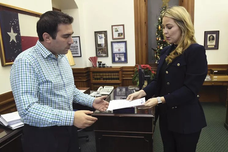 Kate Cochran-Morgan meets with Kevin Fletcher, legislative aide for state Senator Jane Nelson, while lobbying for medical marijuana on Dec. 14, 2016.