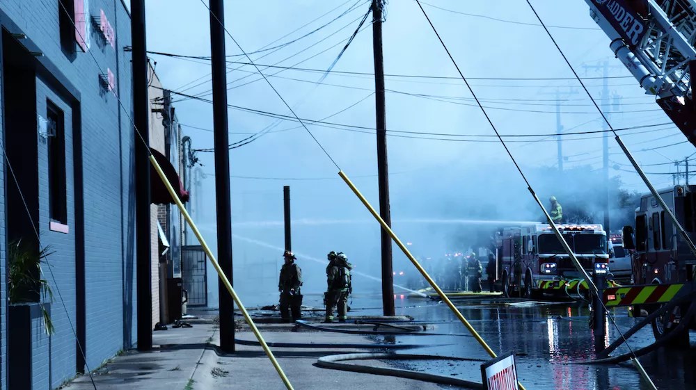 Dallas firefighters wade through water and foam flowing from their efforts to quench a warehouse fire in the Design District.