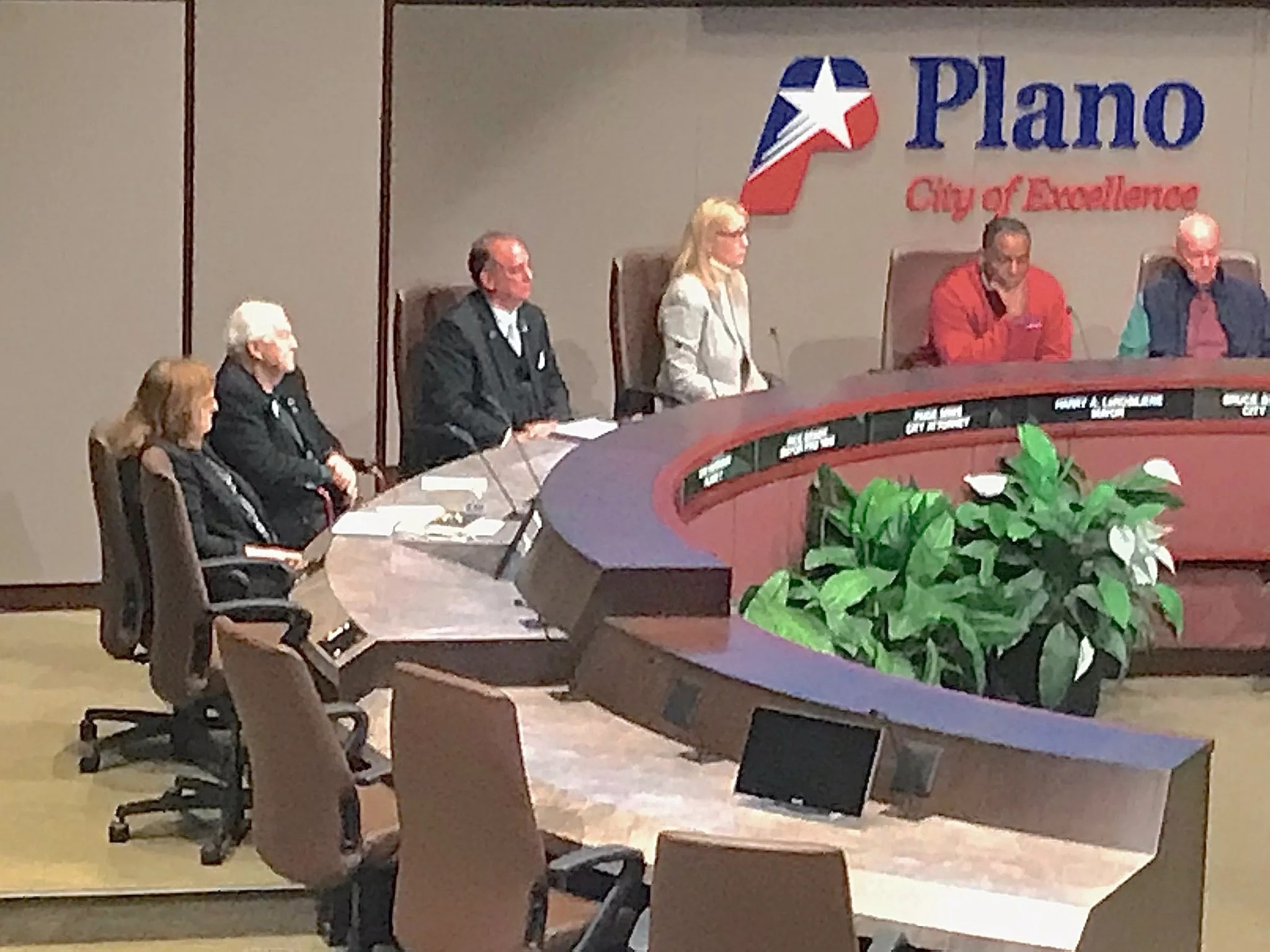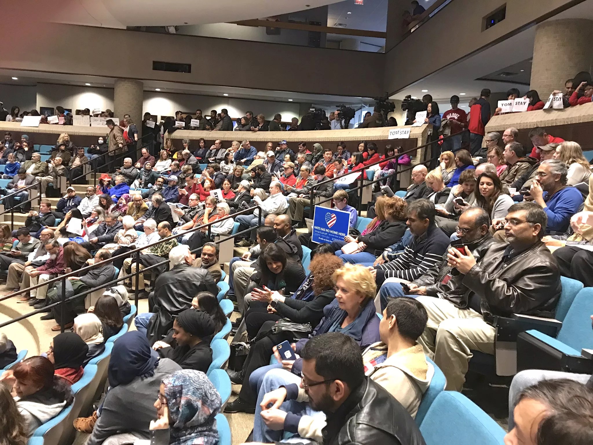 Council members stressed Plano’s inclusiveness as a community, a fact that was in evidence in the crowd, with its mix of whites, Asians and Muslims, many wearing hijabs and holding signs both supporting and opposing Harrison.