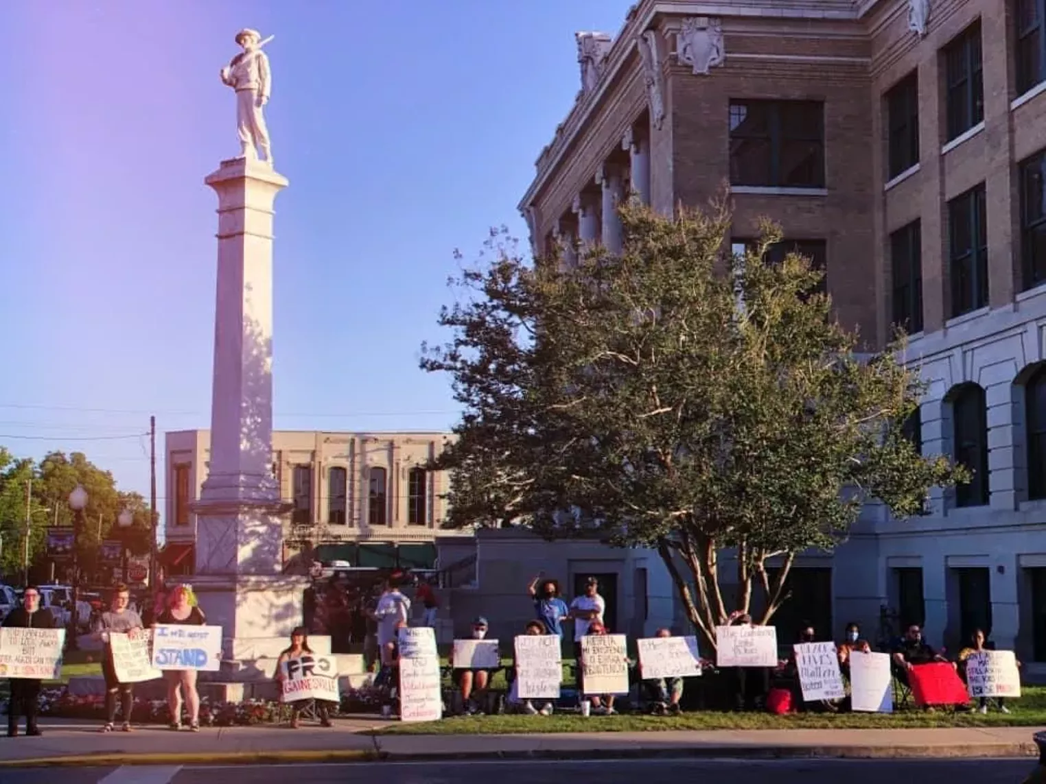 The trio are activists from PRO Gainesville, a grassroots organization that holds weekly protests to demand the removal of the Confederate statue that stands outside the town’s courthouse. Sunday, they had staged a several-block march stemming from the square, and local law enforcement walked alongside them.