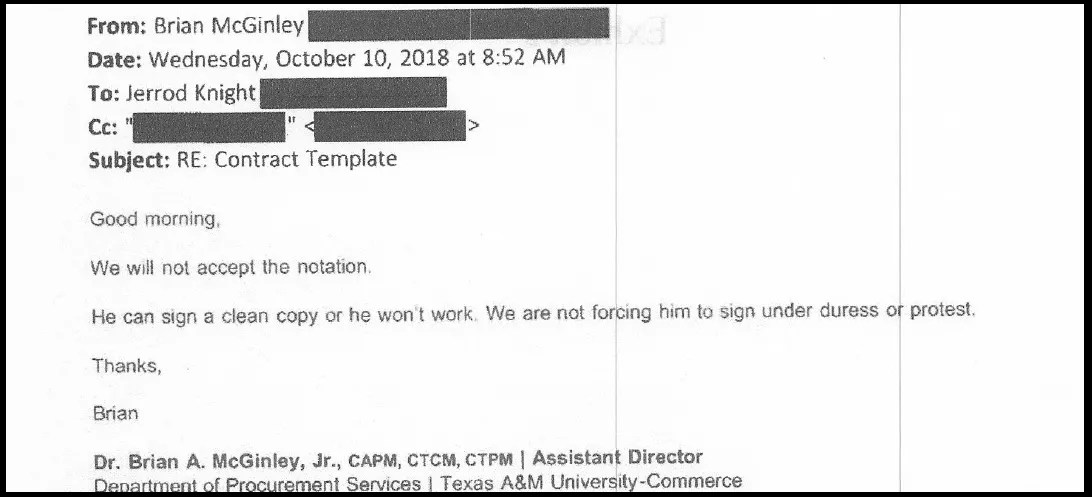 But no dice. Brian A. McGinley Jr., assistant director of procurement for Texas A&M-Commerce, sent the contract with Hale’s marginal notation back to Hale’s liaison with the university with an email saying, “He can sign a clean copy or he won’t work. We are not forcing him to sign under duress or protest.”