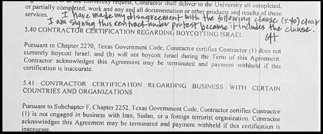 Hale is one of four plaintiffs who have joined the American Civil Liberties Union in a lawsuit against several government agencies that demanded the plaintiffs sign the pro-Israel loyalty oath, and before we go another inch with this, let’s be clear about one thing. In requiring the pro-Israel loyalty oaths, all of those entities were doing what they are required to do by Texas law.
