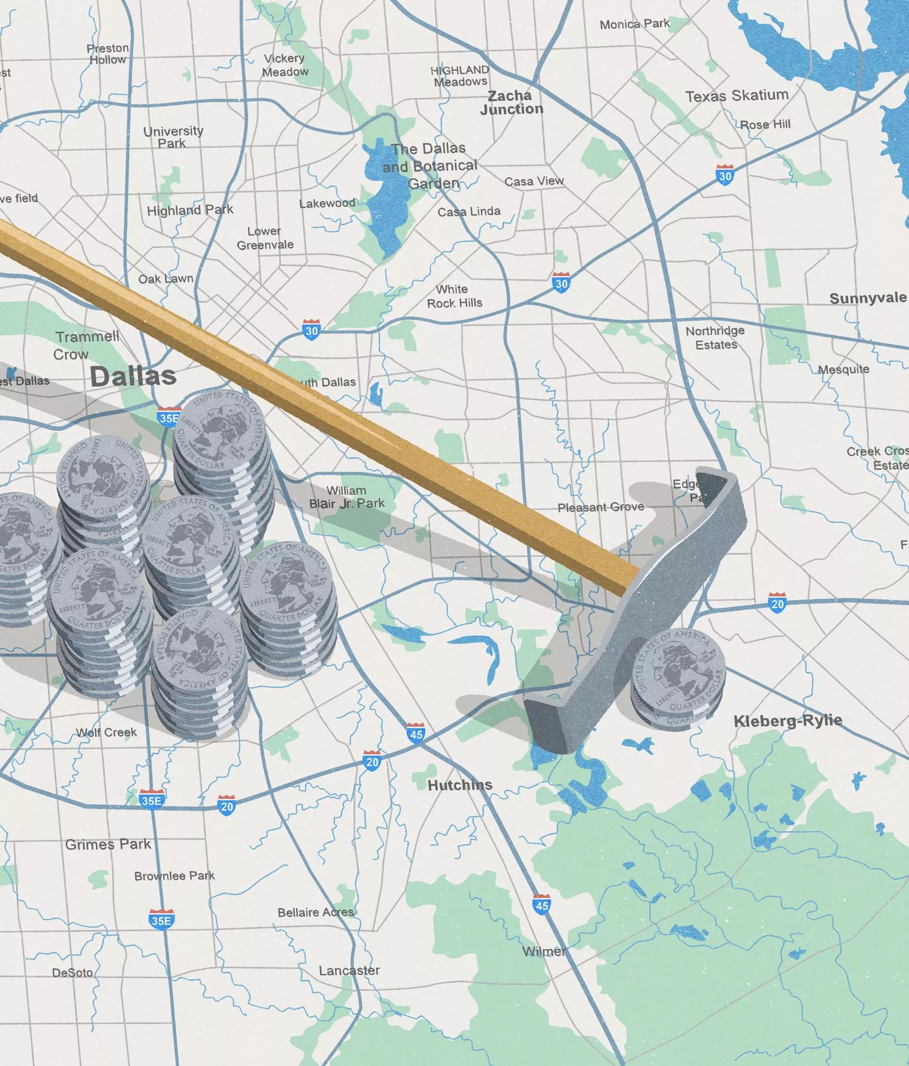 About a dozen miles southeast of downtown Dallas, the Kleberg-Rylie area feels like a different world. Still partly rural, what was once its own small town before it was engulfed by the city is green with wooded land and fields dotted with livestock, ranches, modest houses, mobile homes and empty shacks that once held businesses. Take care if you drive down to take a look at it, though. You’ll find yourself weaving around potholes, illegal dumping and crummy infrastructure, praying you don’t break down along the way. And just hope you don’t need a cop, because you might have to wait a while for one to show up.