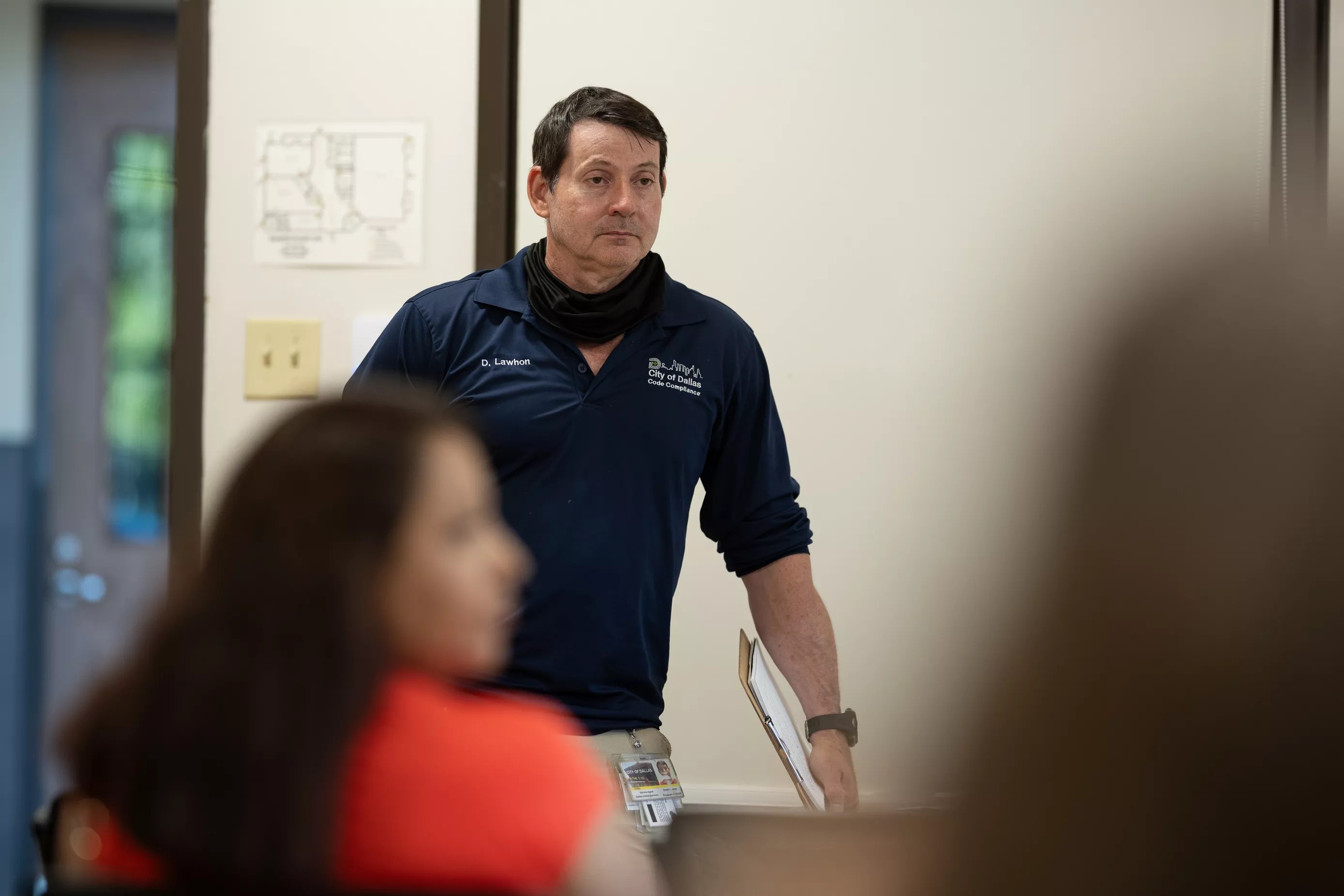 Dallas code officer Doyle Lawhon tells Kleberg-Rylie residents about the code violations in the community.