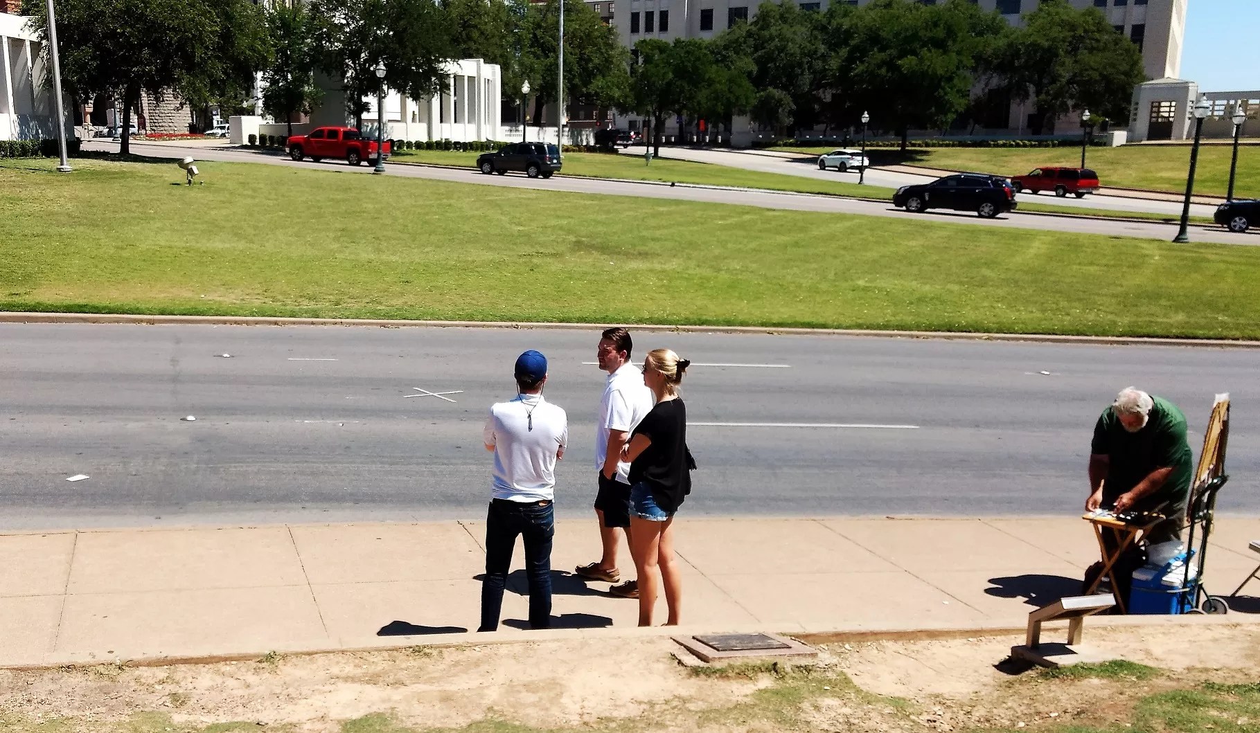 It was a gorgeous day. The sun was soft. A mild breeze rumpled the leaves. Fifty-four years after the fact, people stood with arms akimbo on the sidewalk overlooking the X that marks the spot where John F. Kennedy was shot, still debating in muted voices and nods the one thing we all know we may never know – what really happened.