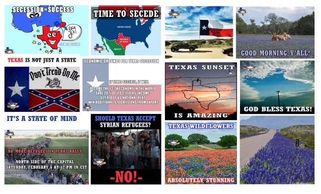 “Heart of Texas visual clusters included a wide swath of shapes of Texas, landscape photos of flowers, and memes about secession and refugees,” the New Knowledge report says.