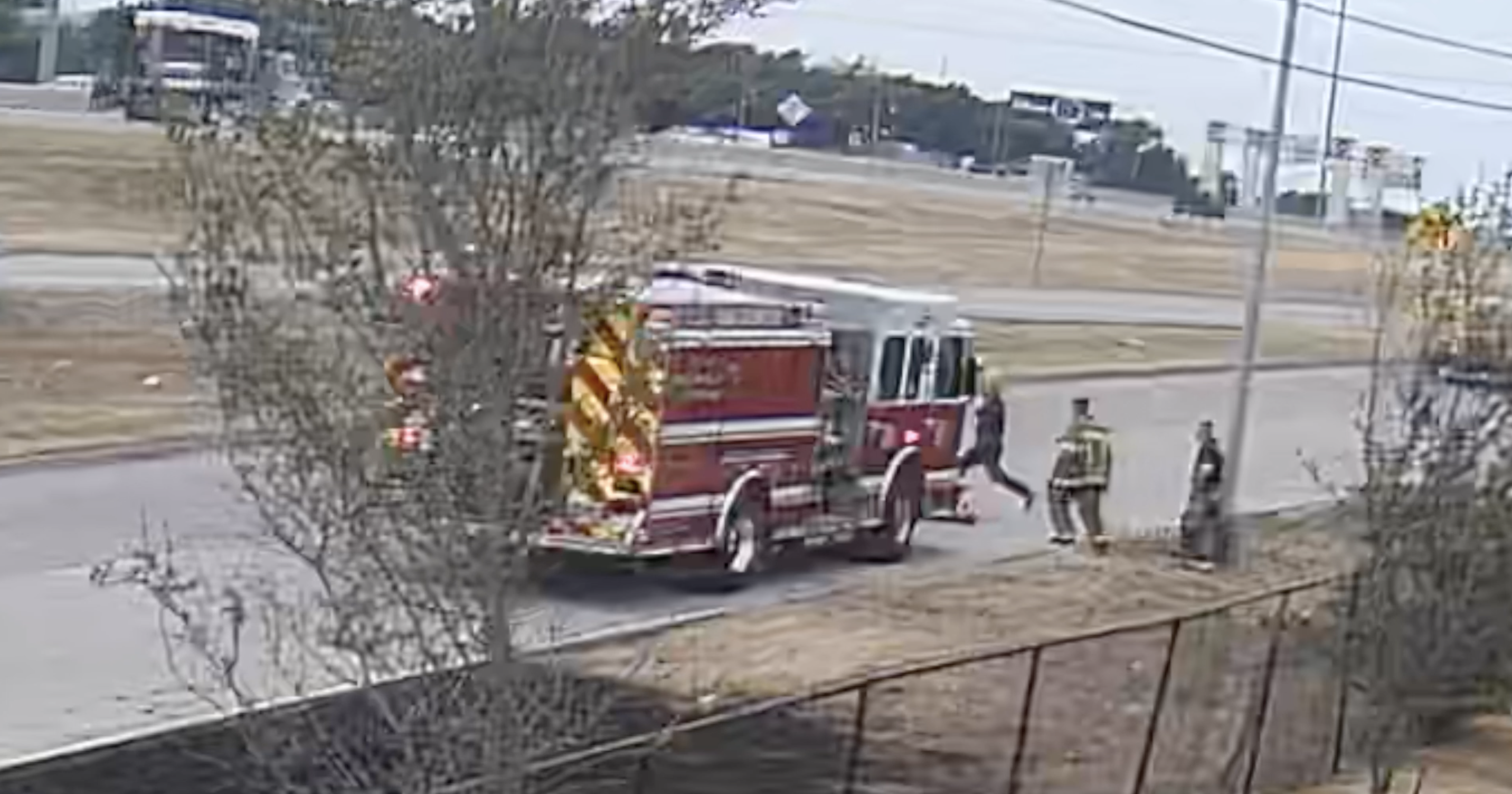 The footage first shows Vess on a curb along the service road. Then, it cuts and Cox appears, walking away from the firetruck. He starts stomping out a patch of grass that appears smoky. Then, the footage cuts again. In the next clip, Vess is on his feet facing Cox, who has his arm out in front of him. Vess moves toward Cox, taking a swing and throwing a piece of PVC pipe at him. Both seem to miss.