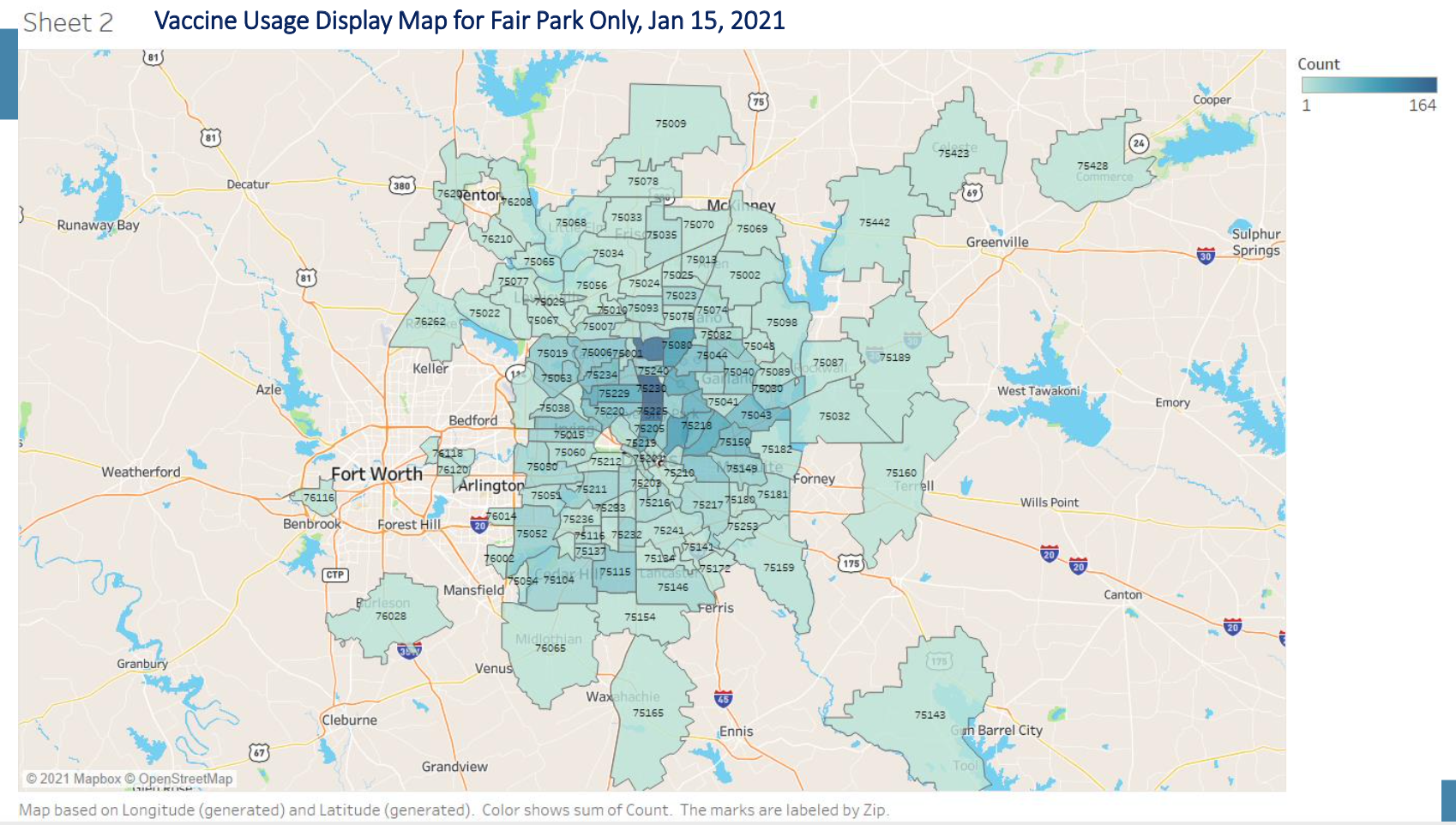 The vaccine usage map above (darker blue = more the vaccines) shows results from the first few days of the mega center, when it allowed for anyone over 75 to show up, no appointment needed. North Dallas folks hopped into their cars and set their nav systems to Fair Park Gate 5.