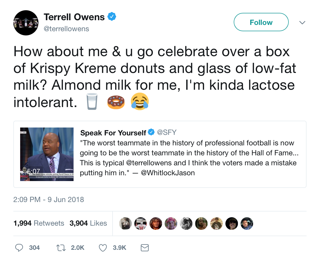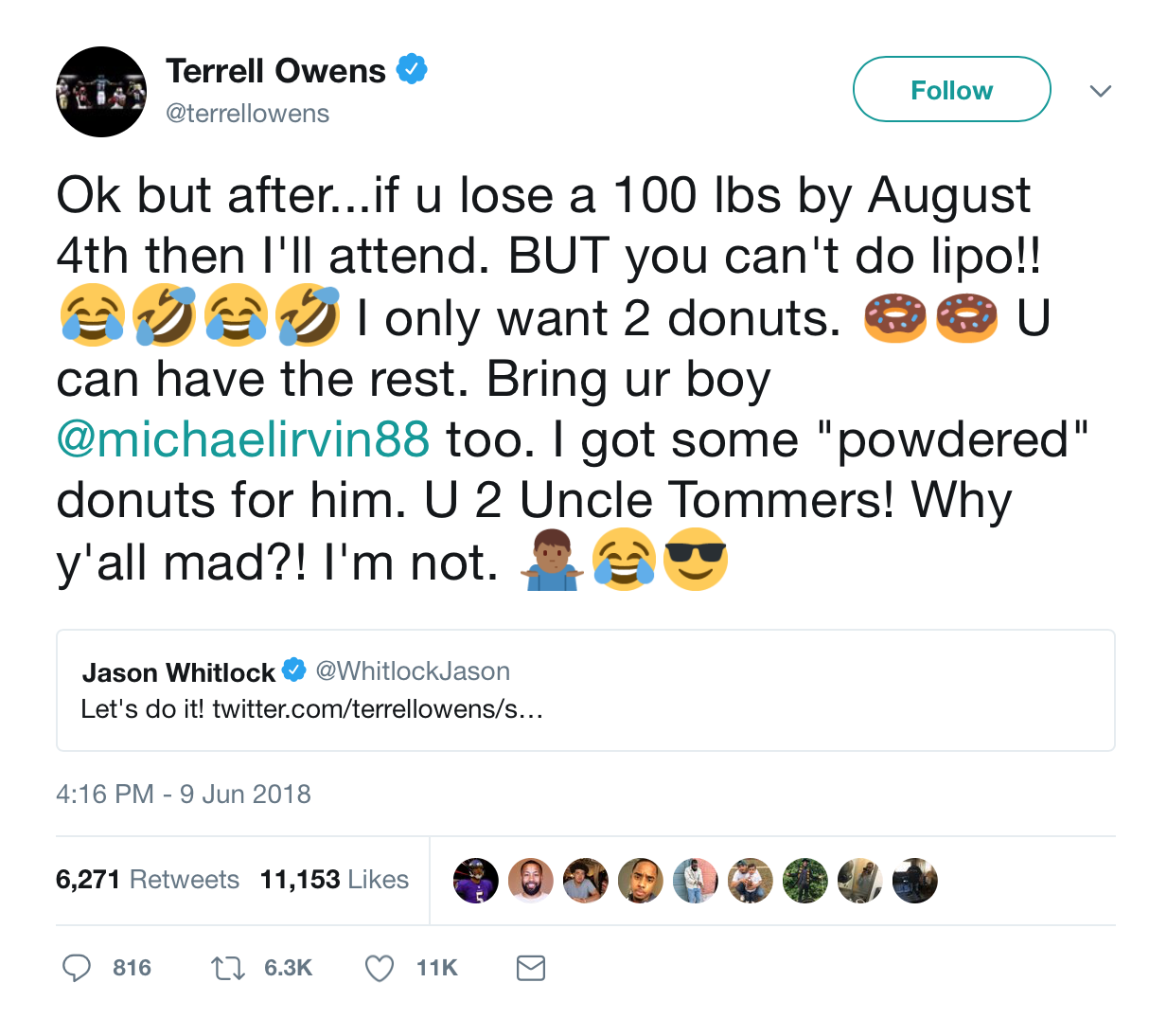 So T.O. called once again upon the power of snacks to rebuke his dissenters, inviting sports commentator Jason Whitlock and Dallas Cowboys legend Michael Irvin to share with him a box of doughnuts, poking fun at Whitlock’s weight and alluding to Irvin’s cocaine use back in the day.