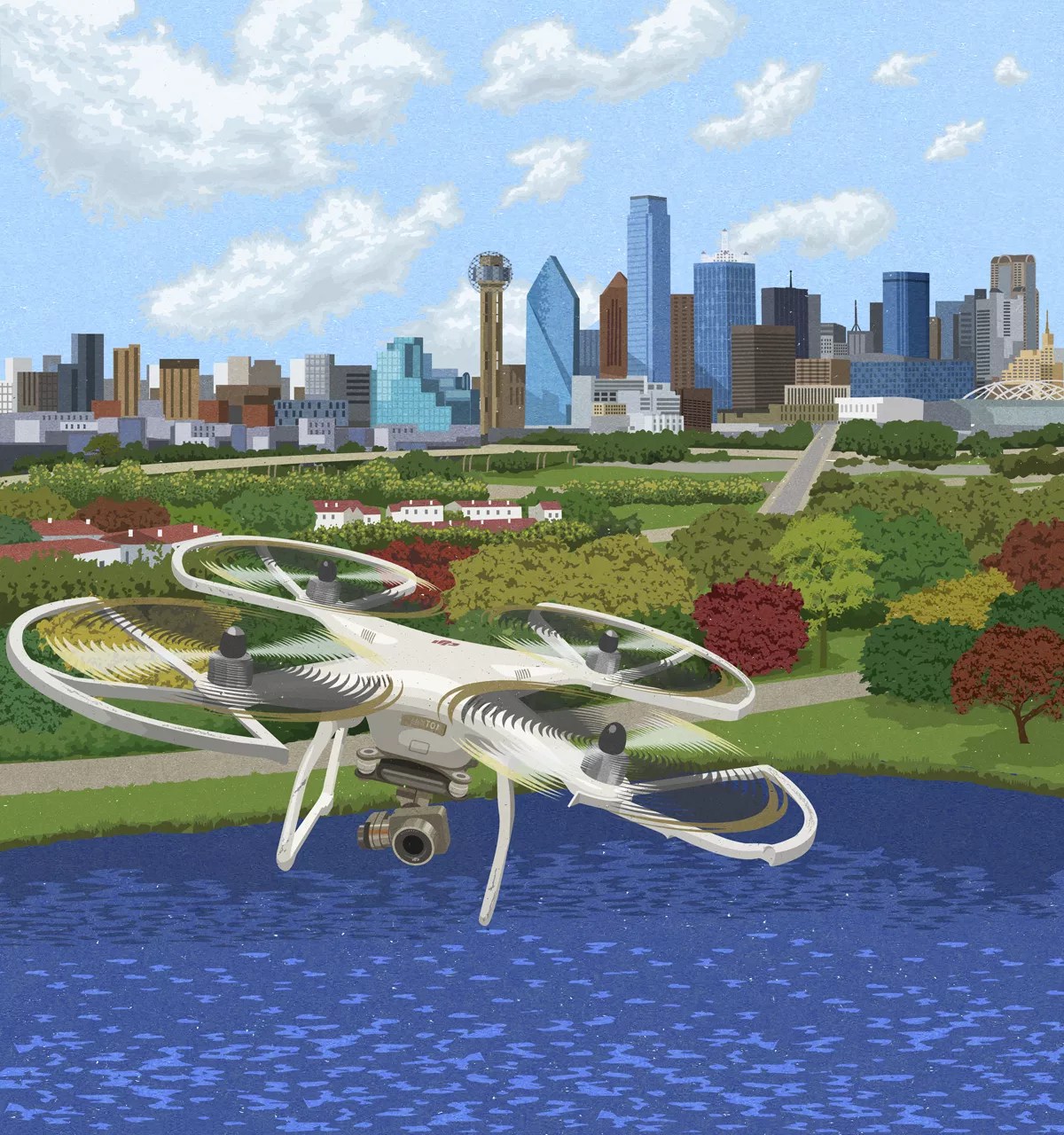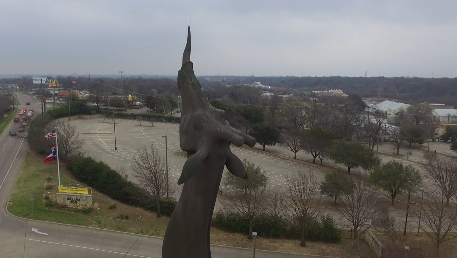 I have an idea to bring the drone to capture new images of Dallas’ statues. I follow the rules, sticking to city-owned areas and keeping far away from private property. I call for permission to fly over the giraffe statue at the Dallas Zoo, buzz the Pegasus downtown and circle the towering, metal figures of Deep Ellum. I pick a soundtrack from an open source music site and let it loose on the public.