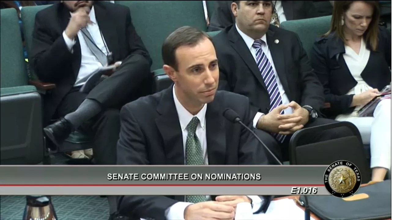 Texas Secretary of State David Whitley appears at a Texas Senate hearing on Feb. 7.