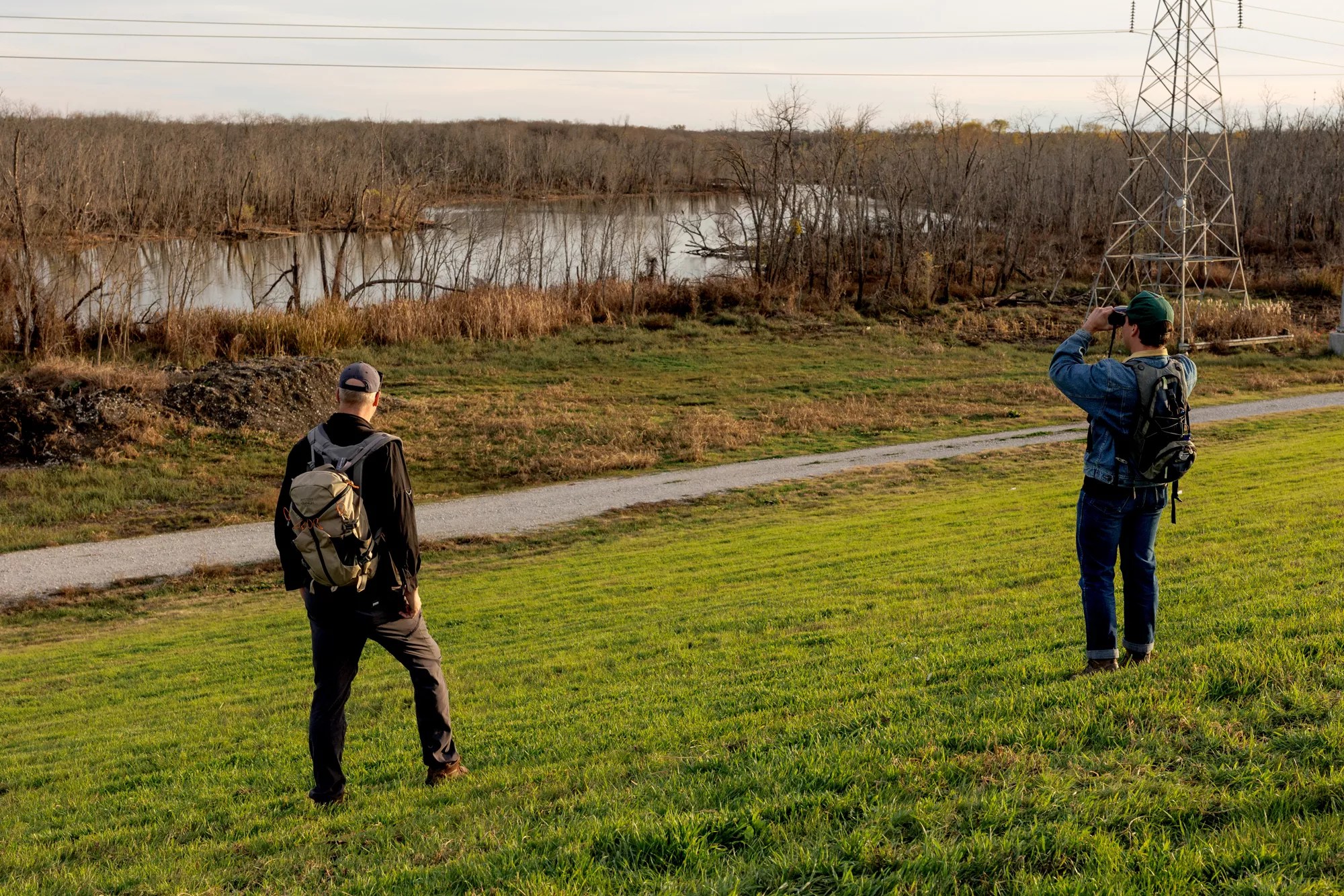 Gravel crunched beneath their hiking boots as the two men neared the barren expanse, backpacks on and binoculars in hand. Dead trees dotted the horizon. A variety of tracks marked the ground, from feral hogs to coyotes to ATVs, and a couple of broken beer bottles reflected the winter sun.