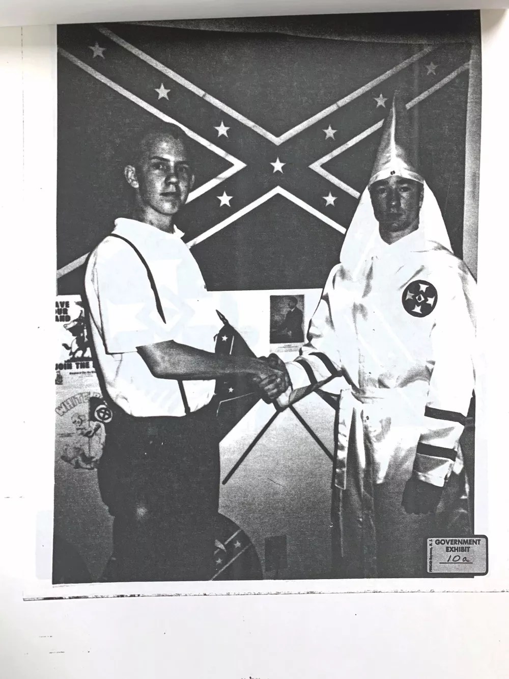 Buchanan filled out an application to join the Confederate Hammerskins. The group welcomed him with a ceremony during which Tarrant donned a Klan robe and a broad smile. The pair shook hands and posed for a photo in front of a Confederate flag. When Tarrant relocated to the Nash House, Buchanan followed and moved in.