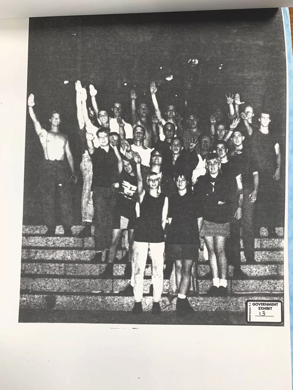 Years after I started my hunt for the Hammerskins, one image from court records sticks with me. Entered into evidence during their trial is a grainy, black-and-white snapshot taken around the time they chased Alexis Newton out of Lee Park. Around two dozen skinheads, only four or five girls among them, are posed in front of “Robert E. Lee on Traveller,” the Confederate monument that once stood tall in the park. Most of them are smiling. All but one or two have their arms raised in a Nazi salute.