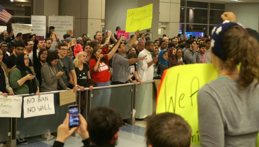 Ahluwalia and other lawyers gathered among the protesters at the international arrival hall in DFW International’s Terminal D were not allowed access to those who were detained. Arriving passengers are not technically on American “soil” until they pass through customs, and thus do not have rights to legal counsel while detained.