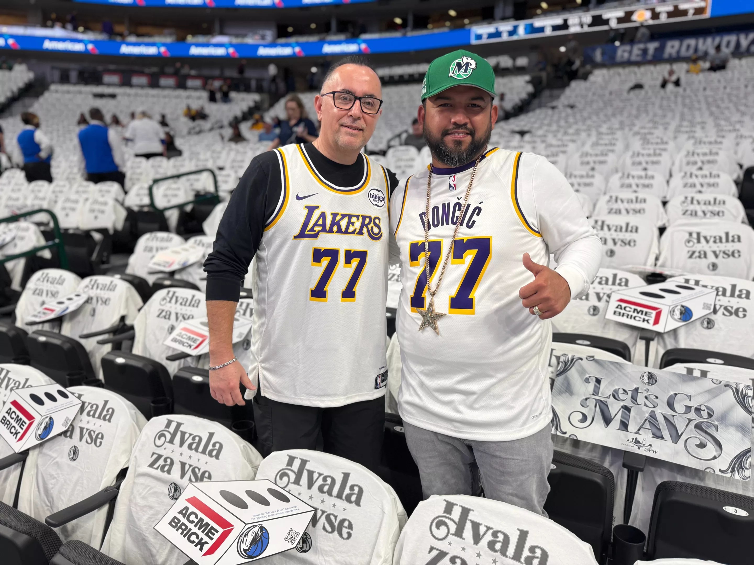 Luka fans Eddie C. (left) and Jesse L. are regulars at Mavericks game but cheered for the Lakers on Wednesday night.