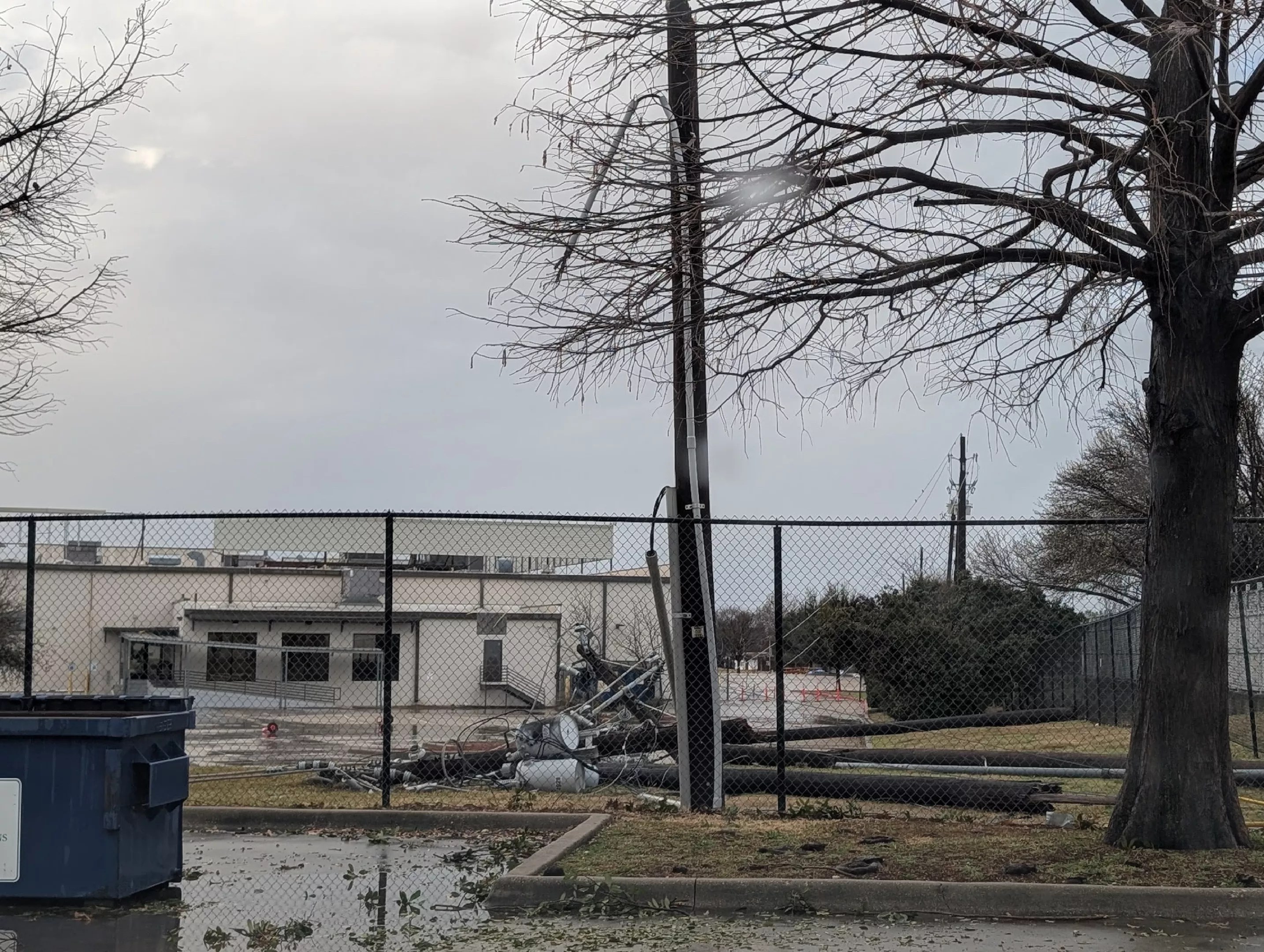 A crumpled power line behind Harmony School on Rosemeade Parkway in Carrollton.