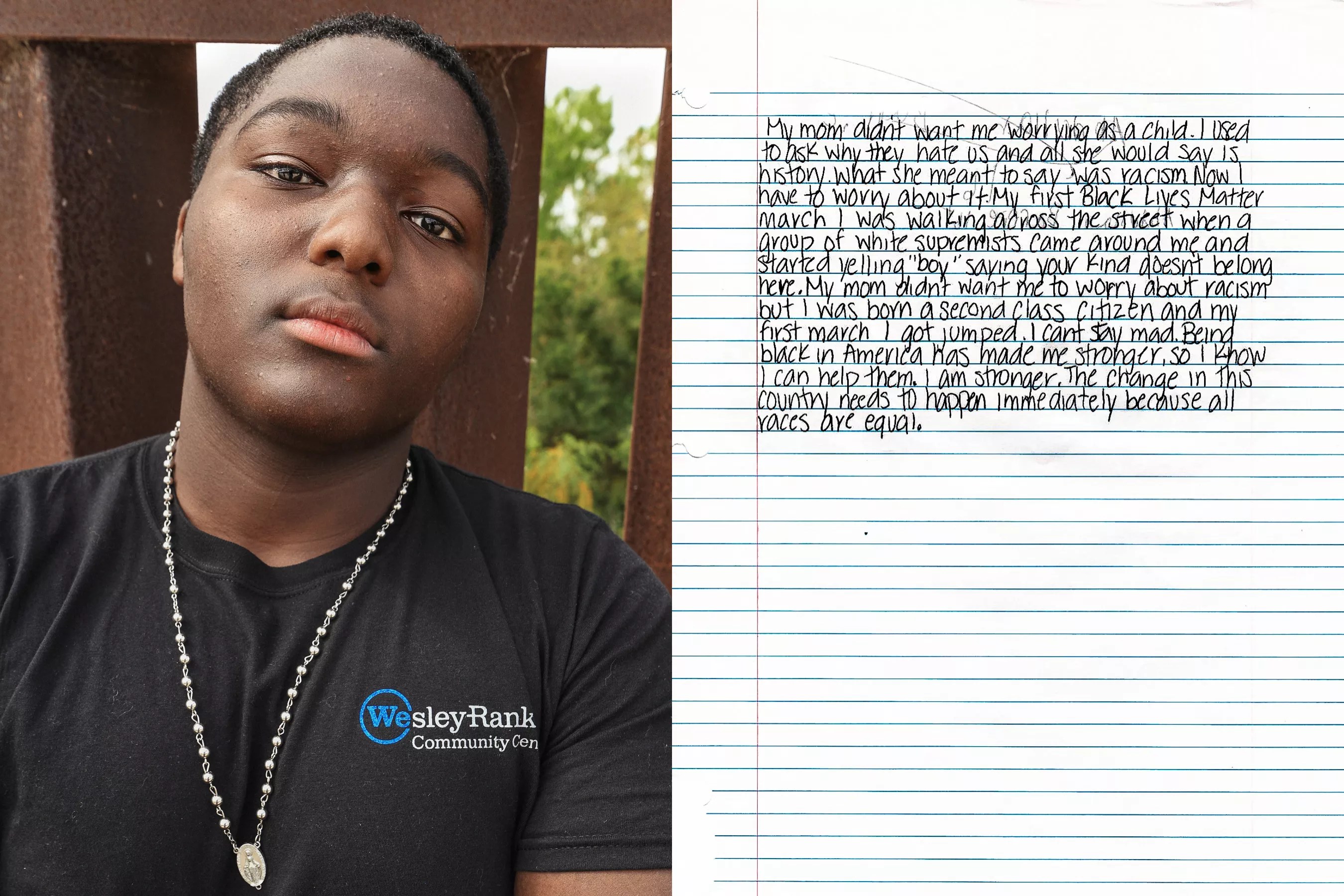 Abdullah, 16, is the only young black man aboard the bus. Tall and confident for his age, he says he was badly beaten by white people, whom he describes as supremacists, the first time he went to a Black Lives Matter march in Dallas.