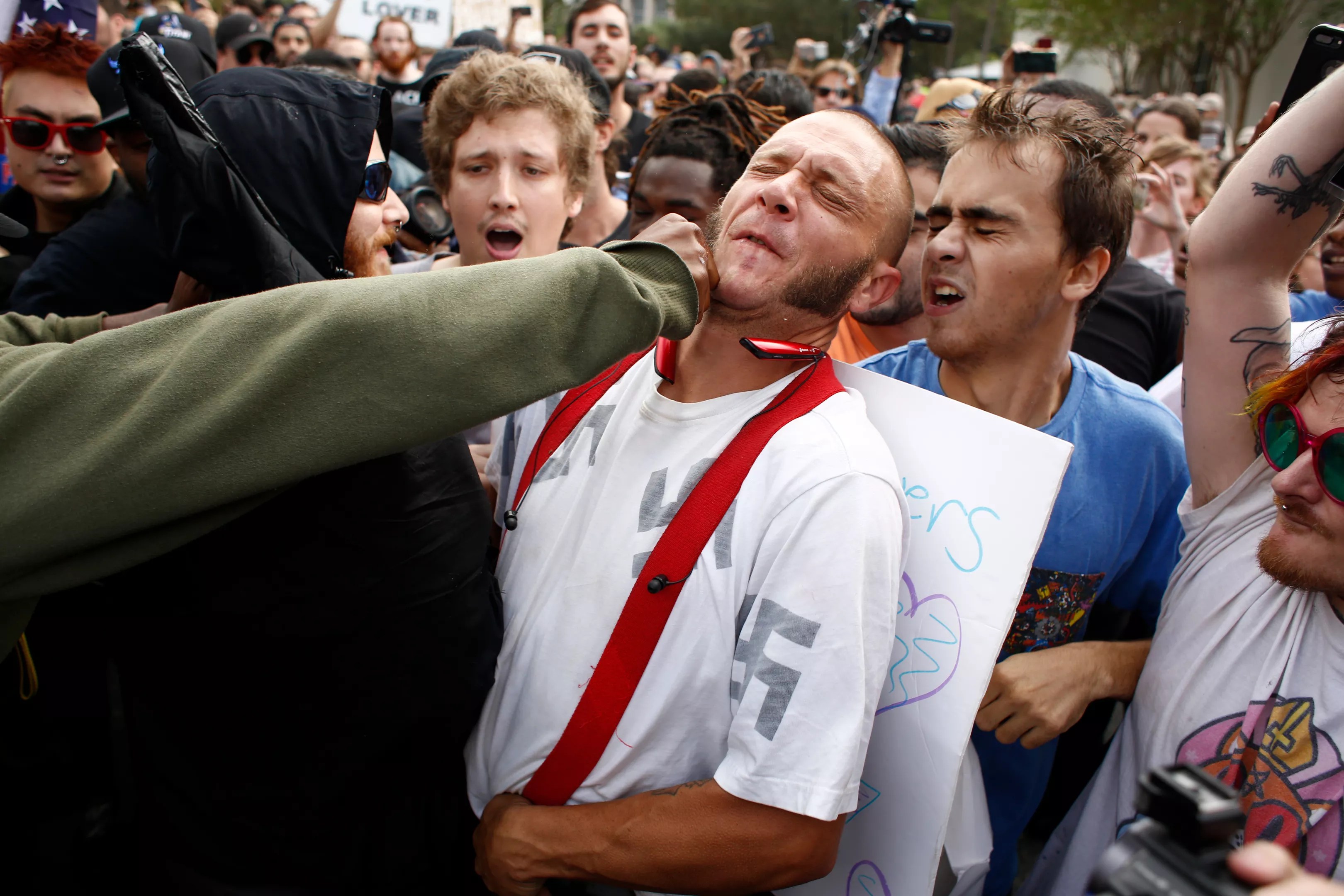 In one particularly ugly incident, about 15 members of the white supremacist group Shield Wall Network disrupted a Holocaust memorial ceremony in Russellville, Arkansas, chanting “six million more,” a reference to the number of Jews killed in the Holocaust. Some waved swastika flags and carried signs with slogans like “The Holocaust didn’t happen, but it should have.”