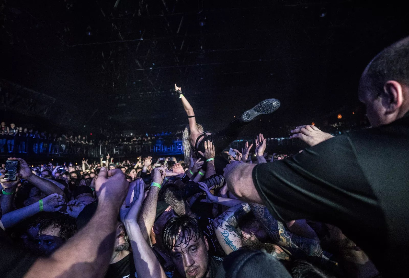 The downward spiral started shortly after the doors opened at 5 p.m. Testament, Behemoth, Anthrax and Lamb of God thundered and raged, much like the three beasts barring Dante’s way into the inferno. As show openers, they were simply adding the spark to a path that Slayer ignited when the group appeared behind the curtain as the upside-down crosses transformed into pentagrams. It was the legendary California metal band’s final time to do so, its final world tour into the abyss for metal fans.