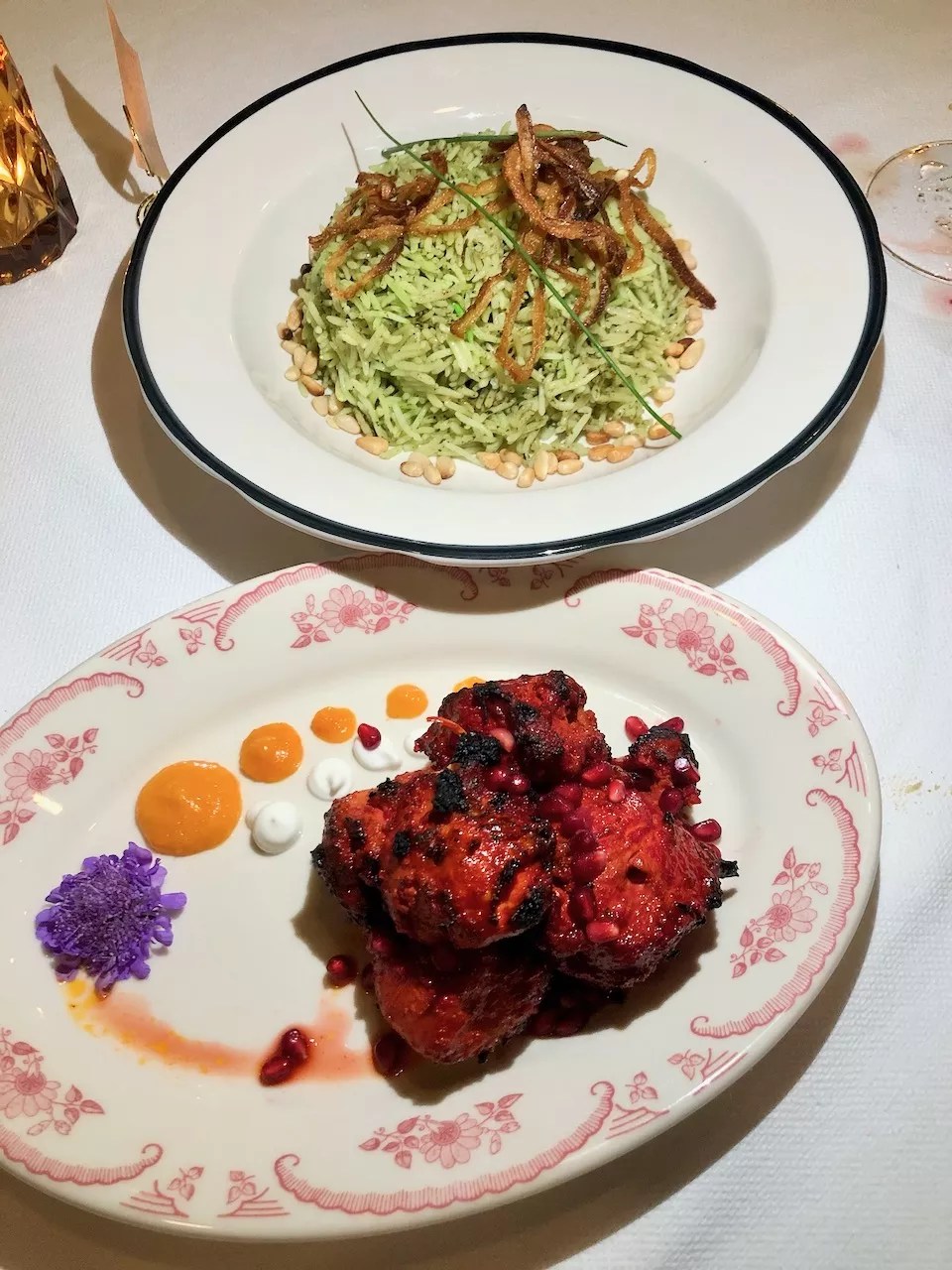 The anari chicken, pictured here with emerald pilaf, is flavored with ginger, chili, fenugreek, topped with pomegranate seeds, along with dollops of yogurt.