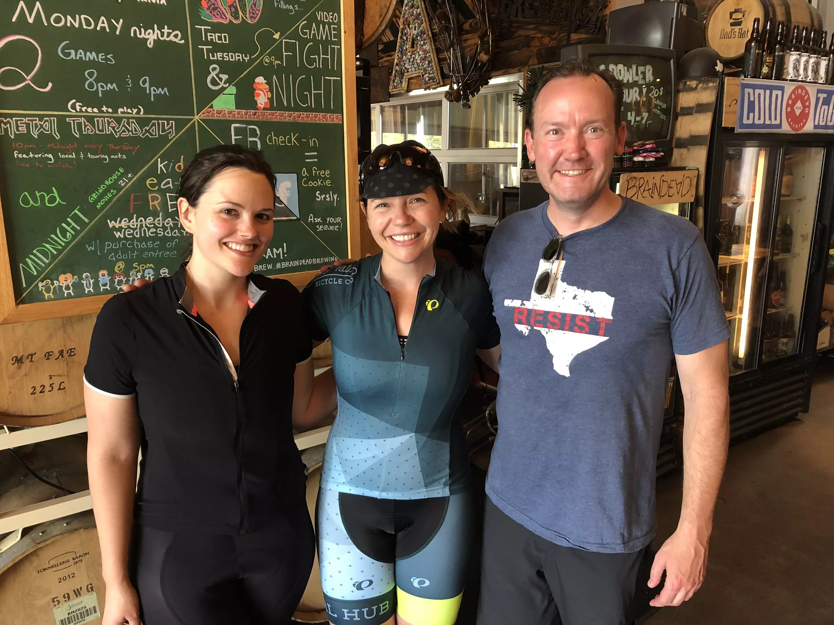Cyclists at BrainDead Brewing: Kristie Holt (a frequent advocate for better bike infrastructure) is center. The author is on the left, and former City Council member and fellow food writer Philip Kingston is on the right.