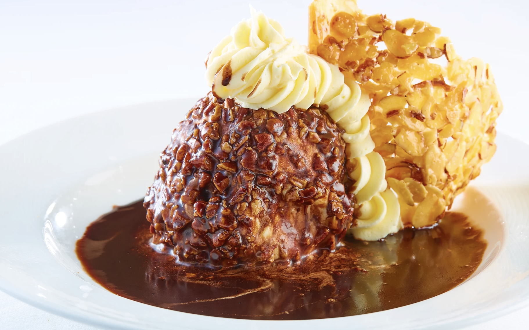 Cafe Pacific’s pecan ball with vanilla bean ice cream and house-made chocolate sauce with pecans and an almond tuile garnish.
