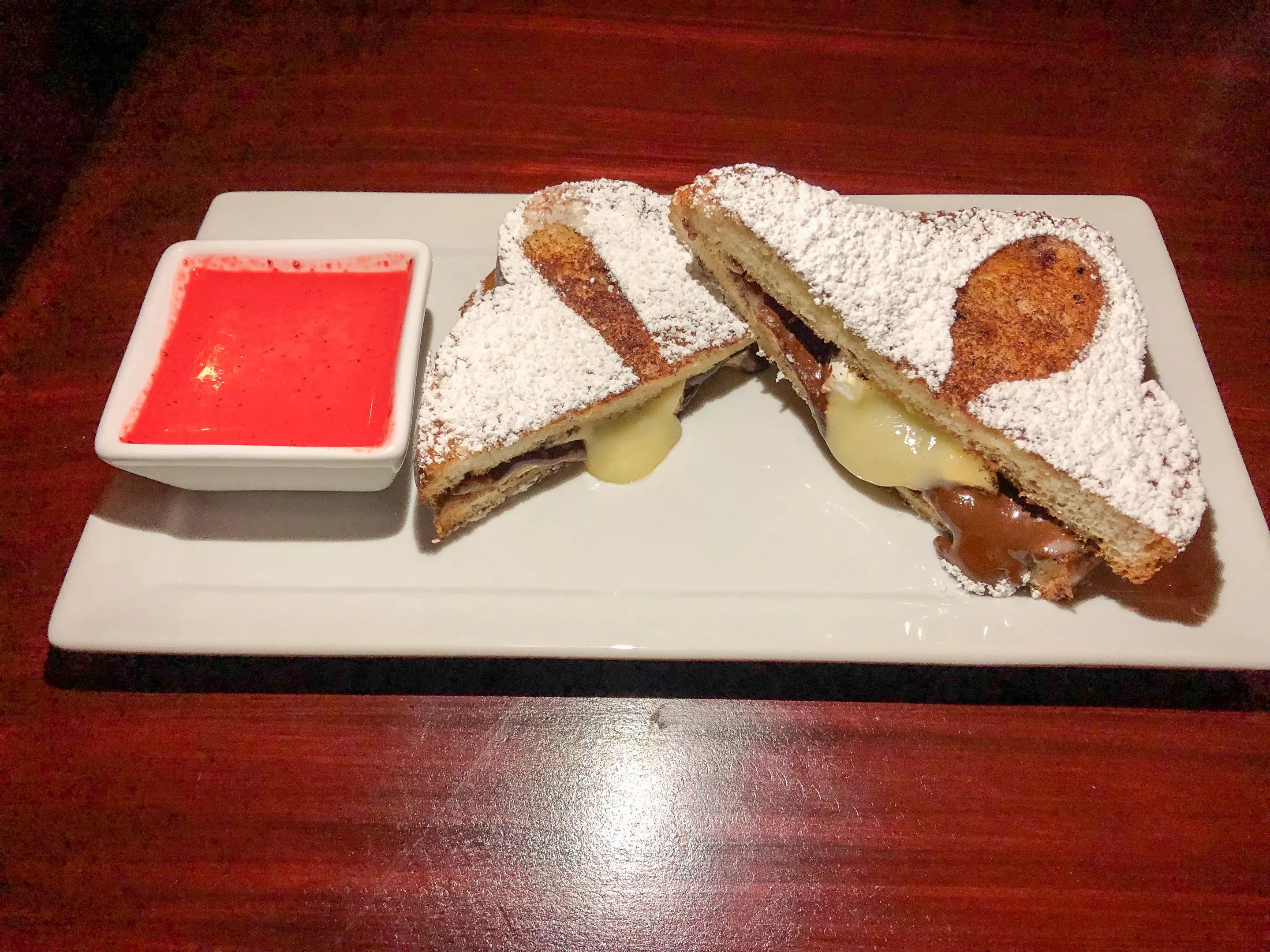The morning after is a grilled brie sandwich with melted Belgian chocolate, topped with powdered sugar and served with a side of strawberry-Champagne dipping sauce.