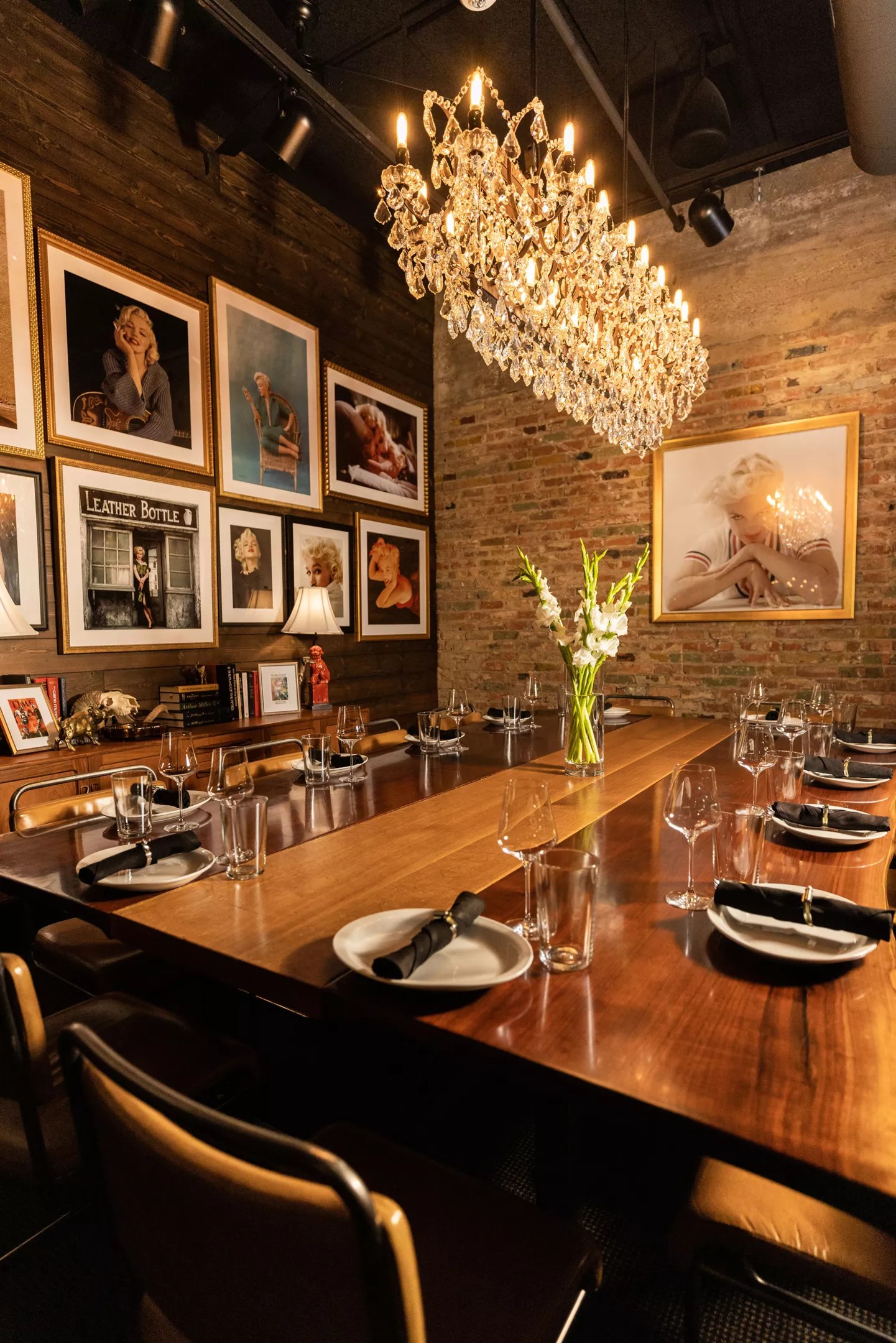 Looking around, the lack of signage downstairs makes sense; the entire budget must have been blown on the interior. “Opulent” doesn’t do the space justice. Every table is a leather-bound booth for six, and mid-century light fixtures with Edison-style bulbs provide just enough warm light over each table.